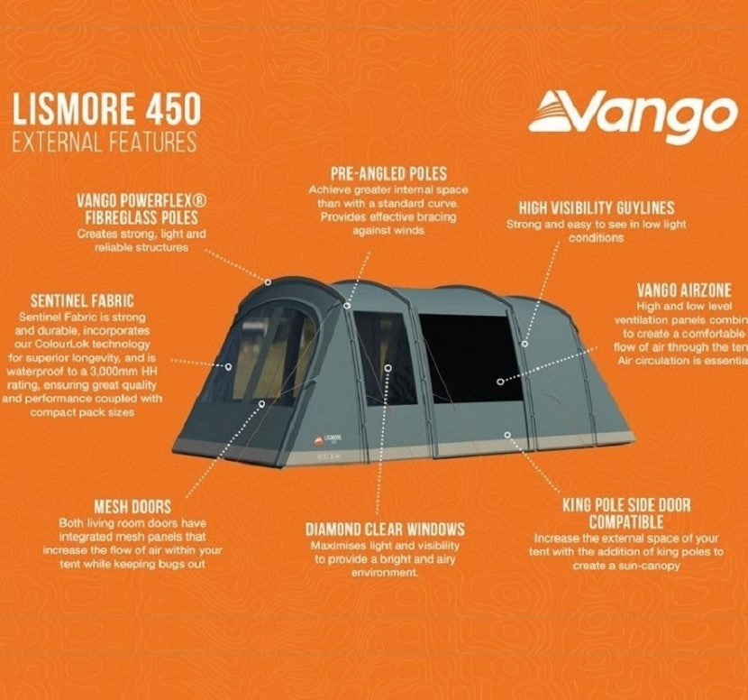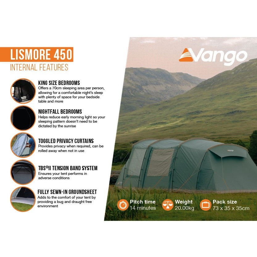 The Lismore 450 from Vango is a 4-man poled tent, which has a fully enclosed integrated front awning offering great usability in all conditions.